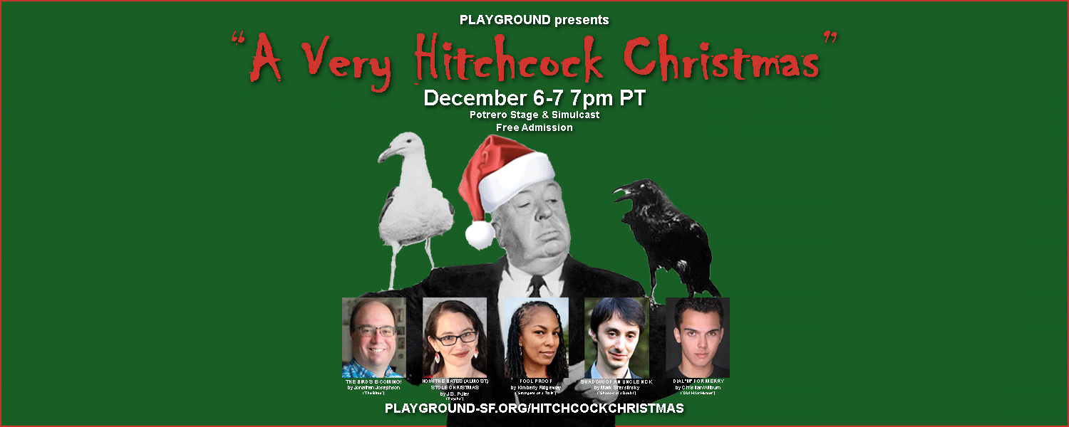 A VERY HITCHCOCK CHRISTMAS was created from submission by playwright alumni in each of PlayGround’s four regions (SF, LA, NYC, and Chicago). Over the last three years, A VERY HITCHCOCK CHRISTMAS reached nearly 2,500 audience members, in person and online. The 2025 production includes two audience favorites from previous years, The Birds is Coming by Jonathan Josephson from 2024 and How the Bates (Almost) Stole Christmas by J.S. Puller from 2023; and three world premiere short plays: Dial M for Merry by Christian Wilburn, Fool Proof by Kimberly Ridgeway, and Shadow of an Uncle Nick by Mark Sherstinsky. The plays are in conversation with the Hitchcock films The Birds, Psycho, Dial M for Murder, Strangers on a Train, and Shadow of a Doubt.
